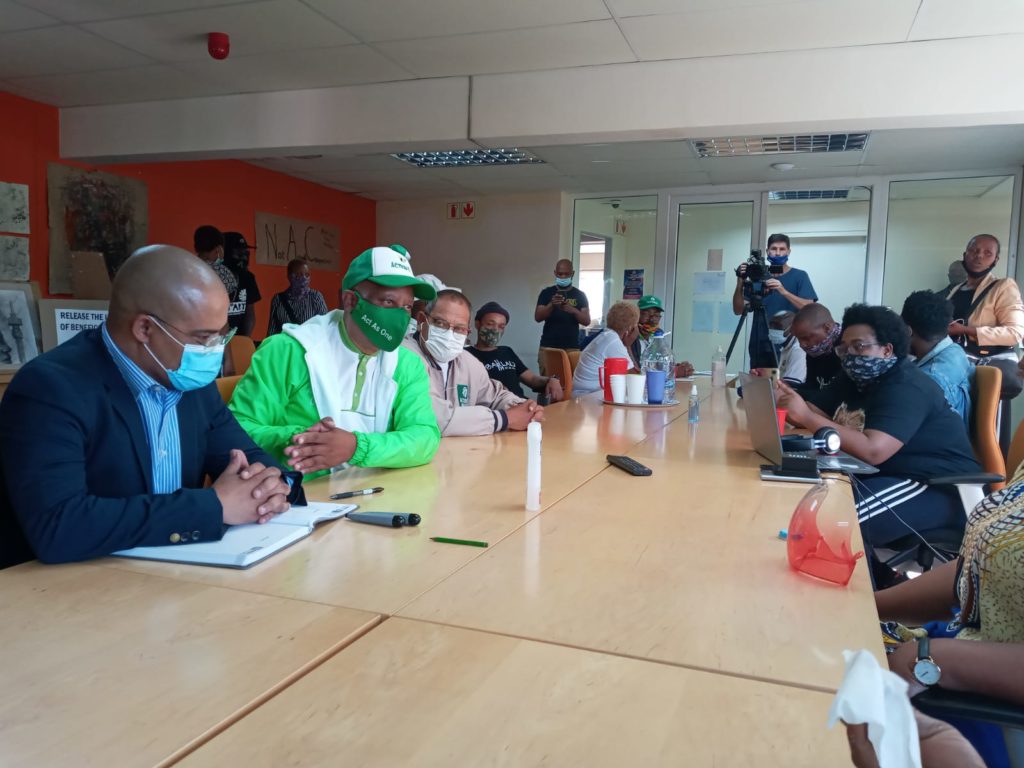 This afternoon, 19 April 2021 at 14h00, my team and I as well as our legal team led by Wendel Bloem of Mkhabela Huntley Attorneys met with opera singer Sibongile Mngoma who leads the protesting artists and other creative arts practitioners involved in the peaceful sit-in that began on 3 March 2021 at the National Arts Council (NAC) in Newtown.