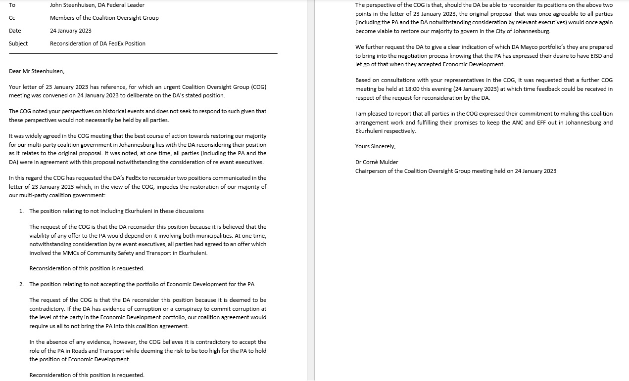 It was also recorded by the coalition that if the DA had evidence of any past wrongdoing on the part of the PA then such should be tabled and the PA should not be brought into the coalition in any position.The DA still refused in the face of all parties advising that their position would collapse talks and ensure the return of the ANC in Johannesburg.