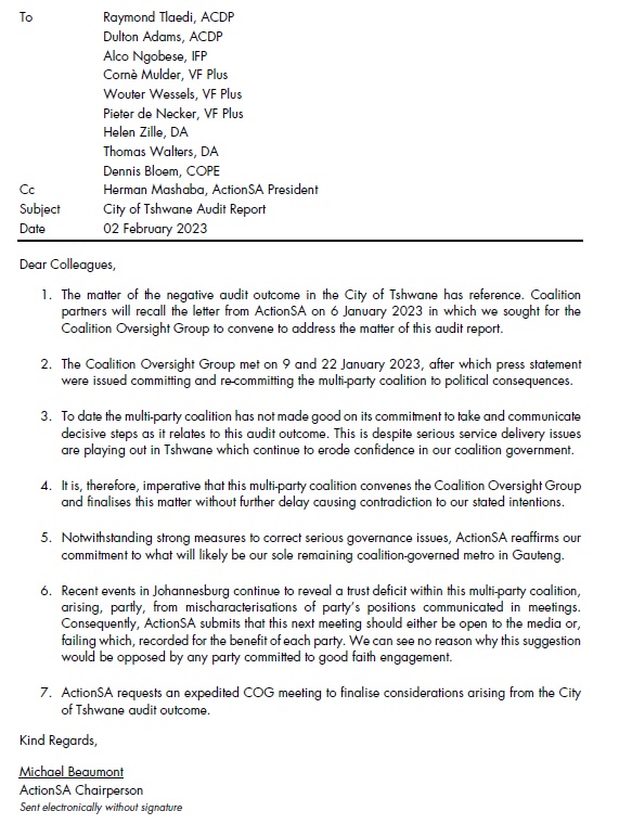 1. We need to safeguard the final coalition in the Gauteng Metros which is the City of Tshwane. There are serious issues that need to be addressed here, not least of which arises from the worst audit outcome in the City of Tshwane’s history. On 10 January 2023 the multi-party coalition met, resolved and communicated, that there must be political consequences for this outcome. ActionSA has written to our partners urging that we need to make good on this commitment, if we are to differentiate ourselves from the ANC.